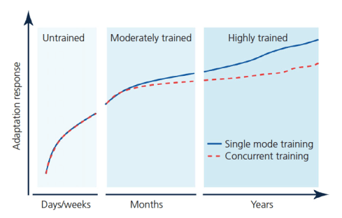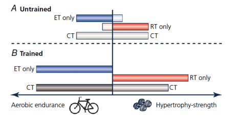 A recent article in The Journal of Physiology2, tells a compelling story of the research that supports what was initially termed the “interference effect” by Hickson in 1980.5 The “interference effect” refers to the decrease in strength gains found in concurrent training compared with the resistance only training (authors concluded that endurance training “interfered” with strength gains from resistance training). This effect appears to hold out in well trained individuals, however there is some evidence that any type of training can initially improve strength and endurance in untrained individuals (see figures below for a nice visual, from: Coffey & Hawley, 2017):