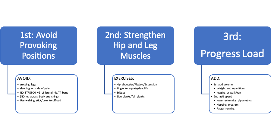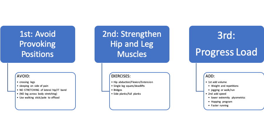 The keys to treating GTPS are similar to how you would go about treating a gluteal tendinopathy* due to the likely presence of this pathology within the “Syndrome” of GTPS. Treating GTPS should include: