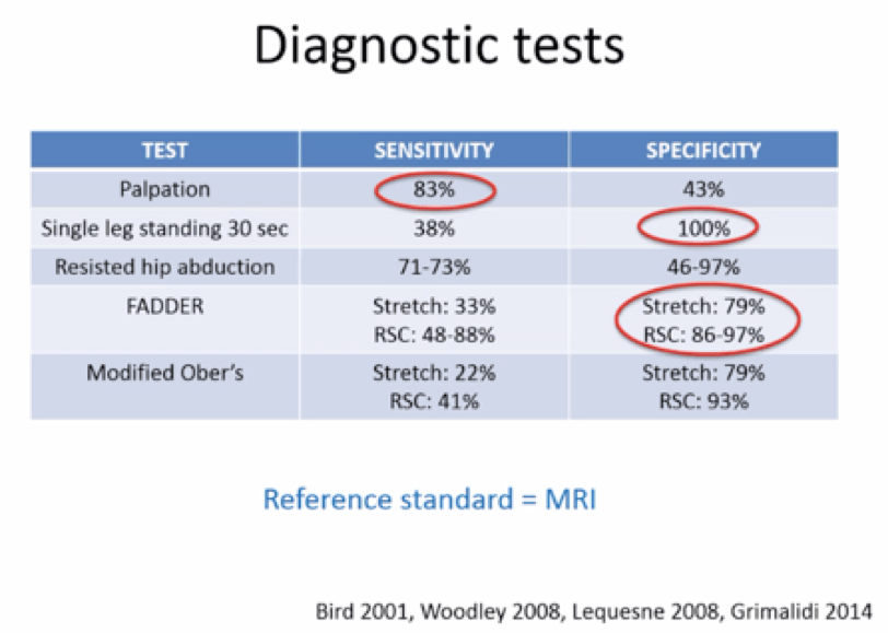 - Palpation (at greater trochanter) good sensitivity, POOR specificity, so good test to rule OUT diagnosis if the test is NEGATIVE!)