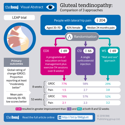 - Mellor R, Bennell K, Grimaldi A, et al. Education plus exercise versus corticosteroid injection use versus a wait and see approach on global outcome and pain from gluteal tendinopathy: prospective, single blinded, randomised clinical trial. The British Medical Journal. 2018; 361:k1662.