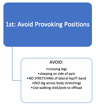 - In the short term: no stretching of lateral structures (IT band, hip abductor muscles)