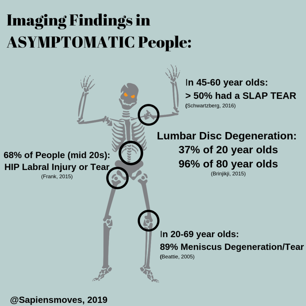 So-called “pathological” findings on imaging studies do not mean something needs “fixed”. There are many examples of populations of individuals who are asymptomatic (read: functioning just fine!) that have “pathological” findings on imaging studies. See below for some of these examples (by body region):