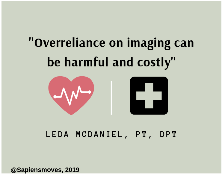 This over reliance and inappropriate use of imaging cannot be taken lightly as it affects not only our health care costs as a society, but can actually be harmful to patients’ physical and psychological health! In fact, some patients with “pathological” imaging findings of their spines, yet NO SYMPTOMS have undergone surgery seemingly due to the imaging findings alone!24 . Research has demonstrated that risks associated with overusing imaging include exposure to radiation, overutilization of surgical techniques and diagnostic “labelling” with pathoanatomic diagnoses that may be inaccurate at best and pathologize what may be best described as normal, age-related changes7. Physical therapists have a key role to play in how imaging is viewed and used by patients. A recent study conducted on patients with low back pain, found that those that saw a physical therapist first were less likely to obtain expensive imaging studies9.