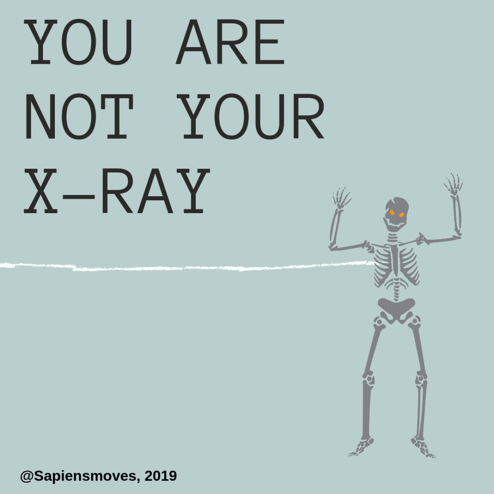 Another useful analogy taken from research on body image is that of the undue focus on body weight or body mass index (BMI) as indicators of health. Though these two measurements can be useful as parts of a broad examination of health, they are in no way a completepicture of the health of an individual. Likewise, an x-ray or MRI is just one piece of information that must be interpreted in the greater context of a comprehensive clinical exam (made up of many factors!). As a reminder, this exam should focus MOST SIGNIFICANTLY on FUNCTION!