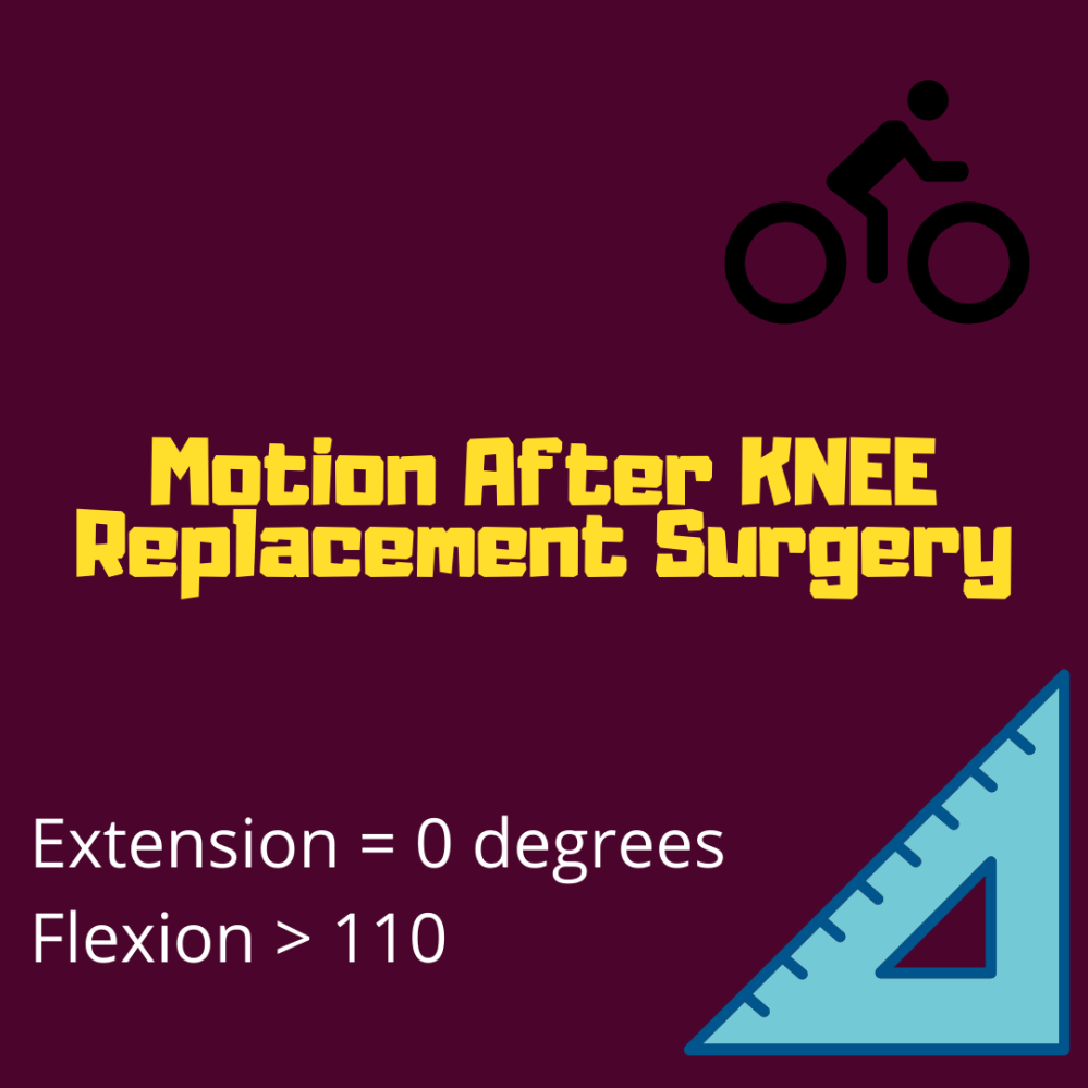 Though there is not a standard amount of “adequate” knee range of motion following TKA surgery, one proposed cutoff is that patients should achieve 0 to 110 degrees of knee flexion range of motion (obtaining full extension or straightening of the joint and able to bend the knee 110 degrees) (Kornuijt, 2018). Recommendations on how early a patient should be able to obtain this range of motion vary based on the surgeon. However, most agree that patients should be at this level within 12 weeks (3 months) after surgery.