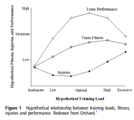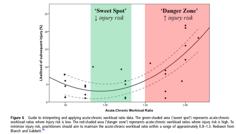 In order to evaluate your patients CURRENT LOAD TOLERANCE (related to prior fitness capacity and current fitness)? You may utilize subjective complaints of pain, objective movement assessment and strength/endurance testing and even may utilize an objective measure such as Acute to Chronic workload ratio to gauge their capacity based on current and past training volumes (Gabbett, 2016). All of these things can help you attain the “sweet spot” of dosing so that you are optimizing performance and reducing injury risk (see graphs below from Gabbett, 2016):