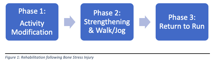The overall progression of rehabilitation after Bone Stress Injuries can be simplified into 3 Phases: