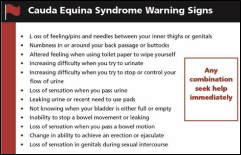 Part of our responsibility as frontline healthcare providers includes screening for “Red Flags” or possible indications of more serious spinal pathology.