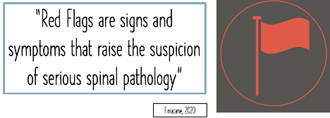 It is important to utilized screening methods that yield important results clinically and that are supported by research for their predictive power (i.e., factors that increase or decrease the likelihood that a pathology is present). Due to the high number of “Red Flag” signs and symptoms described for certain types of serious pathology, red flags have come under criticism if used alone or relied on without carefully scrutinizing their accuracy (Cook, 2018; Galliker, 2019; Verhagen, 2017).