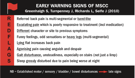 Turnpenney J, Greenhalgh S, Richards L, Crabtree A, Selfe J. Developing an early alert system for metastatic spinal cord compression (MSCC): Red Flag credit cards. Prim Health Care Res Dev. 2015;16(01):14-20.