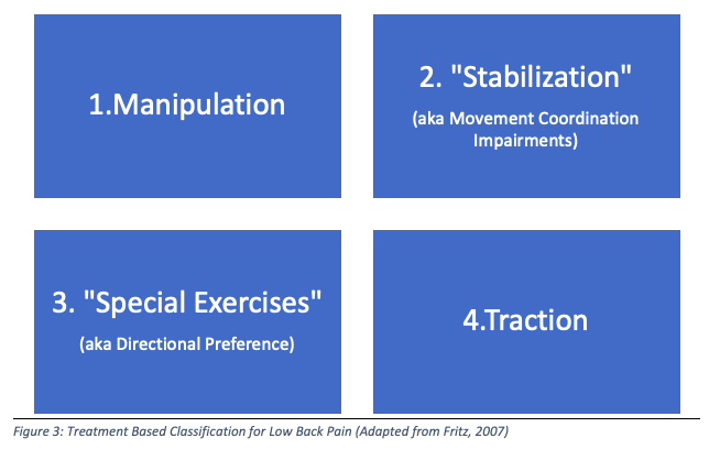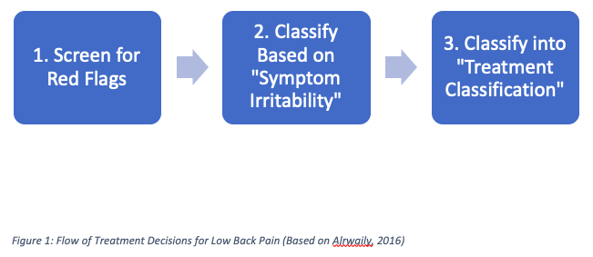 If screening has ruled out more serious causes of low back pain, we move into treatment for what has been termed “Non-specific” Low Back Pain. Treatment decisions are best guided by how bad the pain and symptoms are (symptom “severity”) and how long they take to calm down once they are stirred up (symptom “irritability”). There is also some research evidence that suggests people may respond best if treatment is matched to certain predictive factors about their back pain like how long it has been going on or what movements make their pain better or worse (i.e., assigning “Treatment-Based Classification”). To simplify…