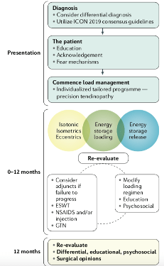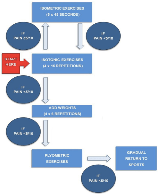 See Below for a recommended treatment progression for tendinopathy (up to 12 months of conservative treatment with re-evaluation!):