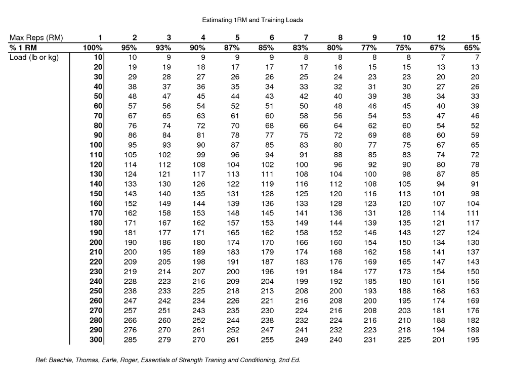 If prescribing exercise for tendinopathy and the individual can perform more than 15-20 repetitions, the weight is likely too light (< 55-65% 1RM). Using this repetition threshold is often useful in the clinic where testing for a true 1RM is often impractical, but one can also use a percentage chart to estimate a 1RM and prescribe weights accordingly.