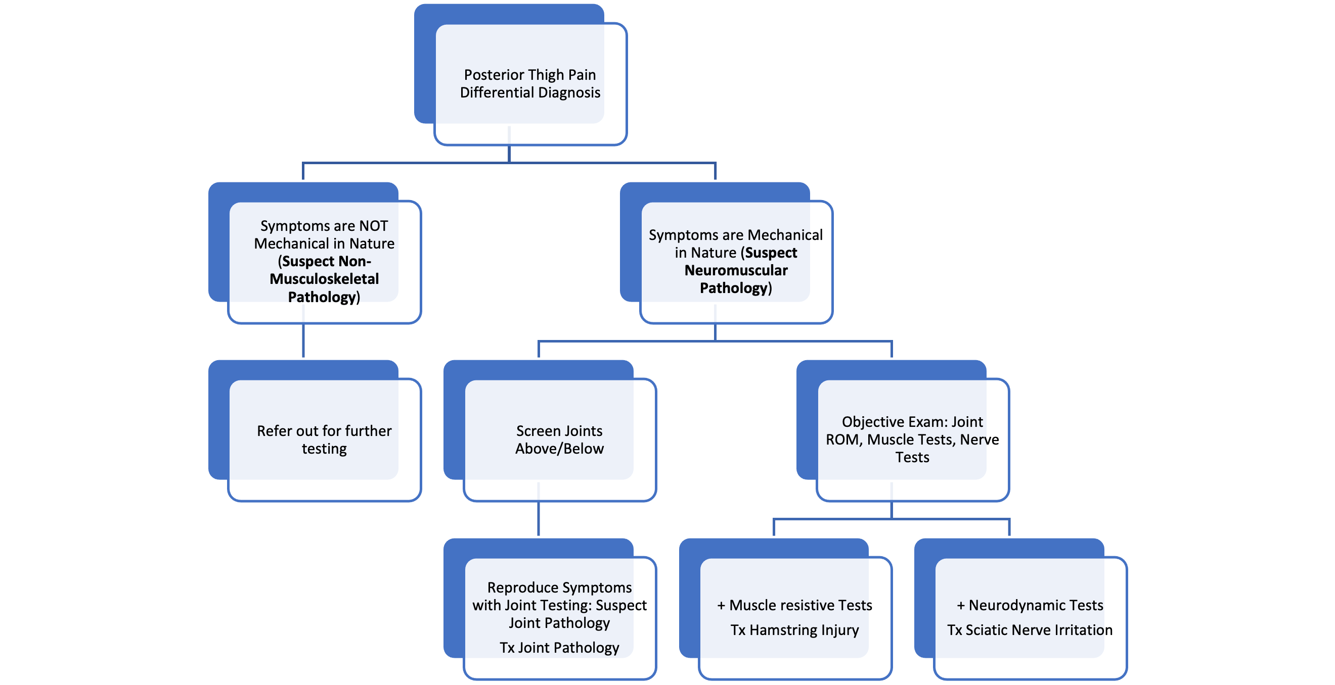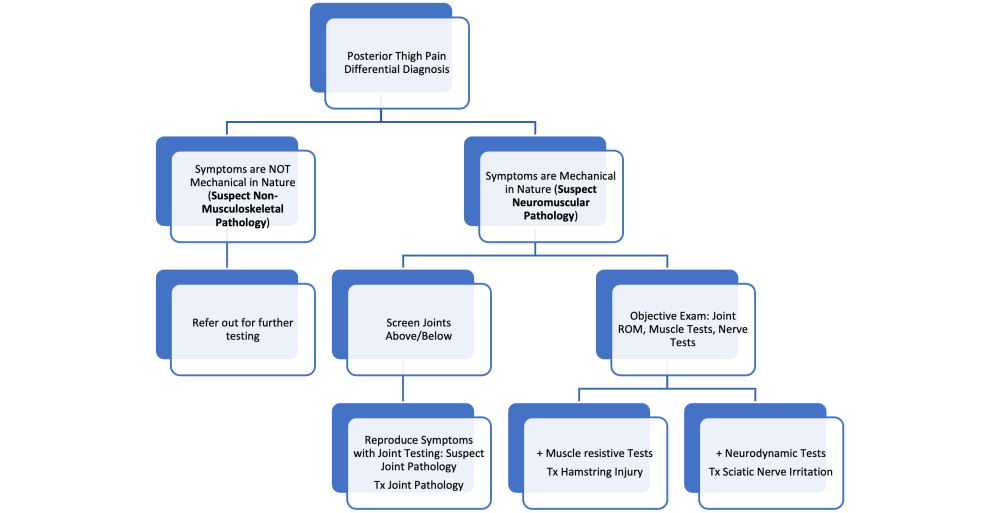 Differential diagnosis of the cause of posterior thigh pain is not always that straightforward. Pain could be from musculoskeletal pathologies such as hamstring strain injury, high hamstring tendinopathy, sciatic nerve pathology, or pain referral from nearby joints (lumbar spine, SI joints, hip joints). Screening out “red flag” pathologies, or those that are not appropriate for physical therapy or conservative care, should be the first step in differential diagnosis. This is often done via a patient’s report of symptom behavior and onset and suspicion is increased if symptoms are not “reproducible” with physical exam testing.