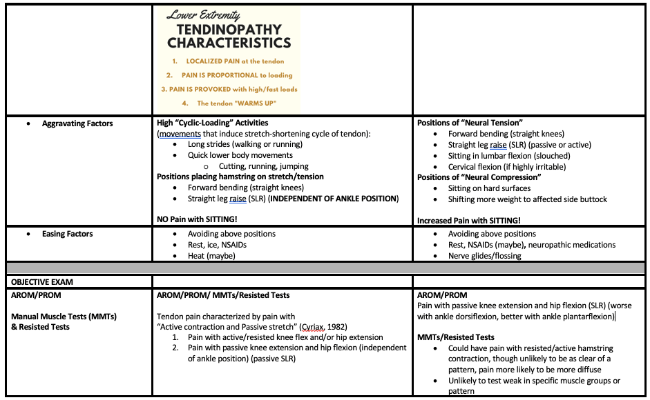 As part of the clinical exam to differentiate between causes of pathology at the posterior thigh, subjective questioning and objective testing can provide clues for which tissue may be most at fault. See table below for a breakdown of these sources of information and possible exam findings for hamstring vs. sciatic nerve related pathology.
