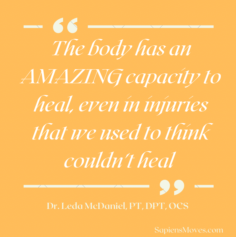 A great way to focus on the positive aspects of injury recovery is to remember that the body has an AMAZING ability to heal and some of our newest evidence and research is supporting healing even in body areas that some believed to be unable to heal without surgical intervention. A few examples of this are spontaneous healing of lumbar disc herniations and ACL ruptures! Check out the articles that I have cited below if you want to learn more!