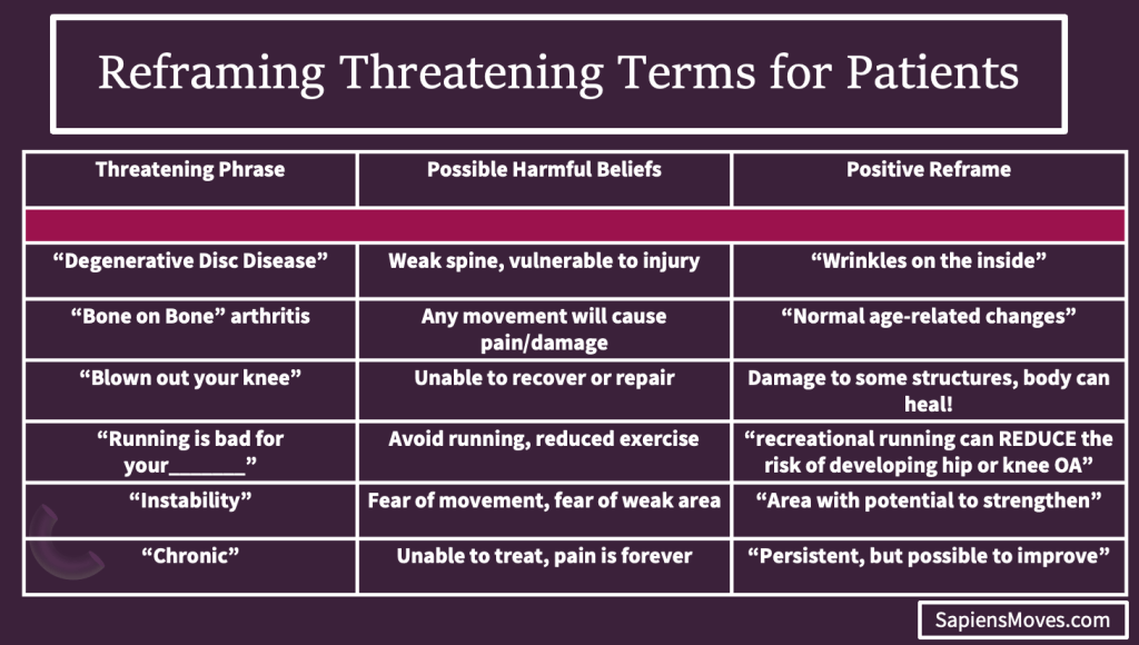 This leads me to really emphasize in my teaching and my work with patients the use of positive language and framing when talking about injury and recovery. It truly is amazing how adaptable we are as human beings and the body’s innate abilities to heal and recover. I also am very passionate about trying to stay away from language that can potentially cause harm (i.e., “nocebo” or “nocebic” language) and language that overemphasizes “pathoanatomical” causes as the ONLY potential cause of pain or injury (For more on this see: “You Are NOT Your X-Ray”).