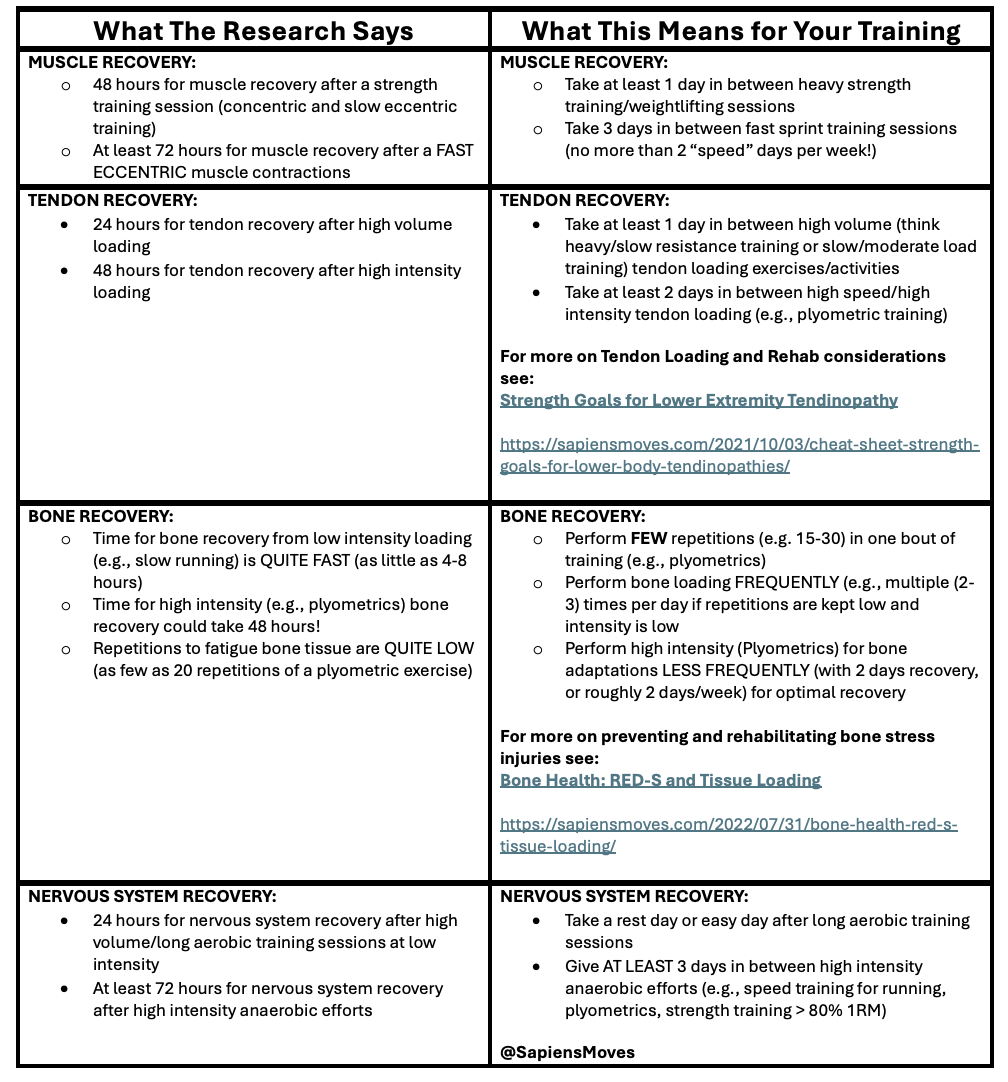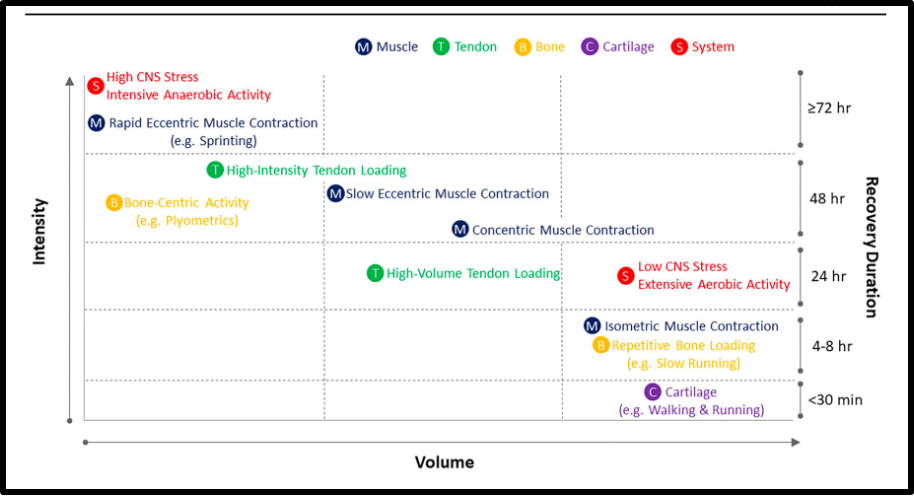 There is a fantastic review paper that came out in 2024 from Dr. Tim Gabbett and colleagues discussing how recovery must be matched to intensity and volume of training and the specific body tissues impacted. See the graphic below from Gabbett, 2024 for a representation of these concepts: