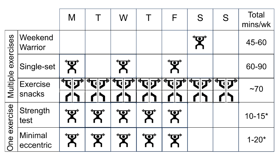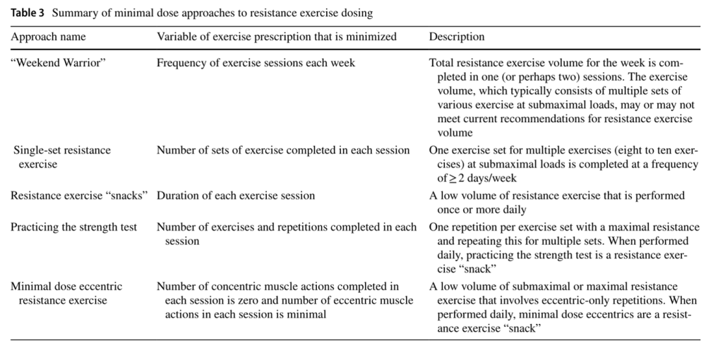 As mentioned above, it is important to DO SOME WORK (e.g., strength train if your goal is improving muscle strength). Interestingly, though, for untrained individuals, you may be able to get away with doing a minimal amount of work and still see increases in strength. For example, a recent review paper looked at the minimum doses to attain improvements in muscle strength and reviewed of five types of “minimal dose” strategies (“weekend warrior”, “single-set”, “exercise snacks”, “strength test”, and “minimal eccentric”). They found that even modest training frequency (in some cases as few as 1 training day per week and as little as 60 minutes per week) could lead to strength gains (Nuzzo, 2024). This is less than what is recommended from the American College of Sports Medicine (ACSM), which recommends a minimum of 2 days per week of strength training targeting all major muscle groups. See Figure and Table below from Nuzzo, 2024 on “Minimal Dose Strategies” for Strength Training: