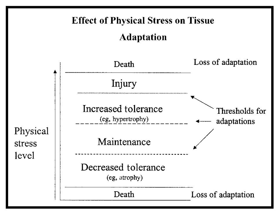 Additionally, you must make that “load” or training session sufficiently challenging (e.g., “intensity” of training) that you induce the changes that you want to see. That means loading with a focus on tissue adaptation. According to “physical stress theory,” tissues respond to the mechanical demand placed on them with predictable adaptations (Mueller, 2002). See figure below from Mueller, 2002: